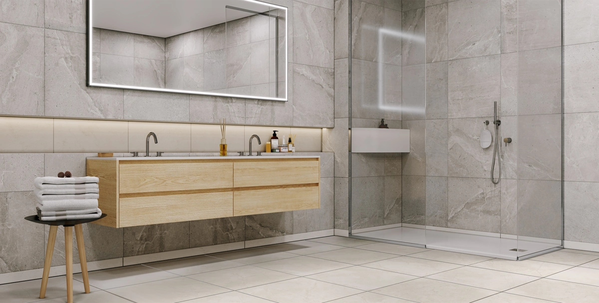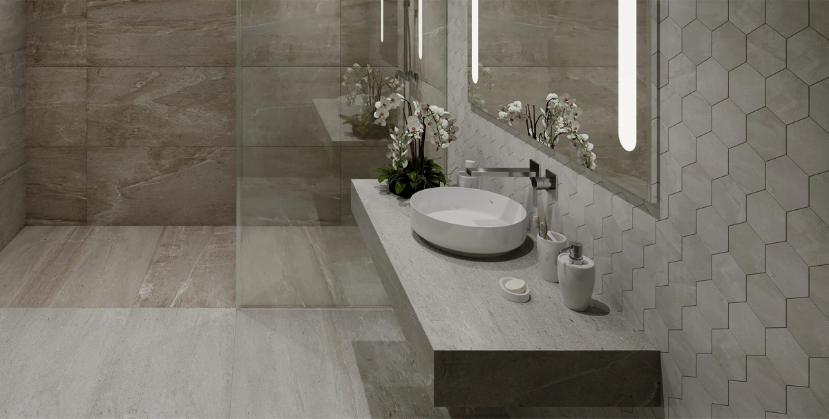 — Коллекция, а также её отдельные элементы подходят для ванной, для душа. Дизайнеры Royalstone могут составить для вас бесплатный 3D проект с использованием плитки из этой коллекции Ametis By Estima.