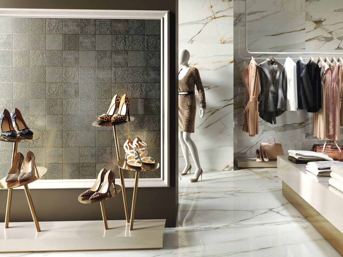 — В составе APE Calacatta Borghini есть керамогранит, ступени, мозаика с рисунками под мрамор.