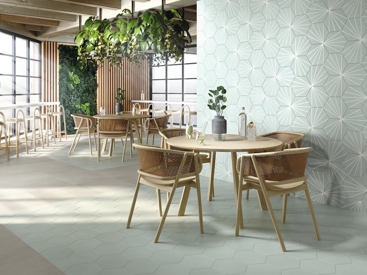 — В составе APE Klen есть керамическая плитка, декоративные элементы, керамогранит, мозаика с рисунками моноколор, в полоску, геометрия.