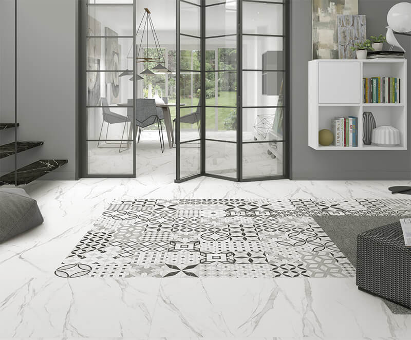 — В составе Arcana Thalassa есть керамогранит, мозаика с рисунками под мрамор, орнамент, в полоску.