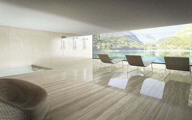 — В составе Arch Skin Stone Travertino есть широкоформатный керамогранит, керамогранит, мозаика с рисунками под травертин.