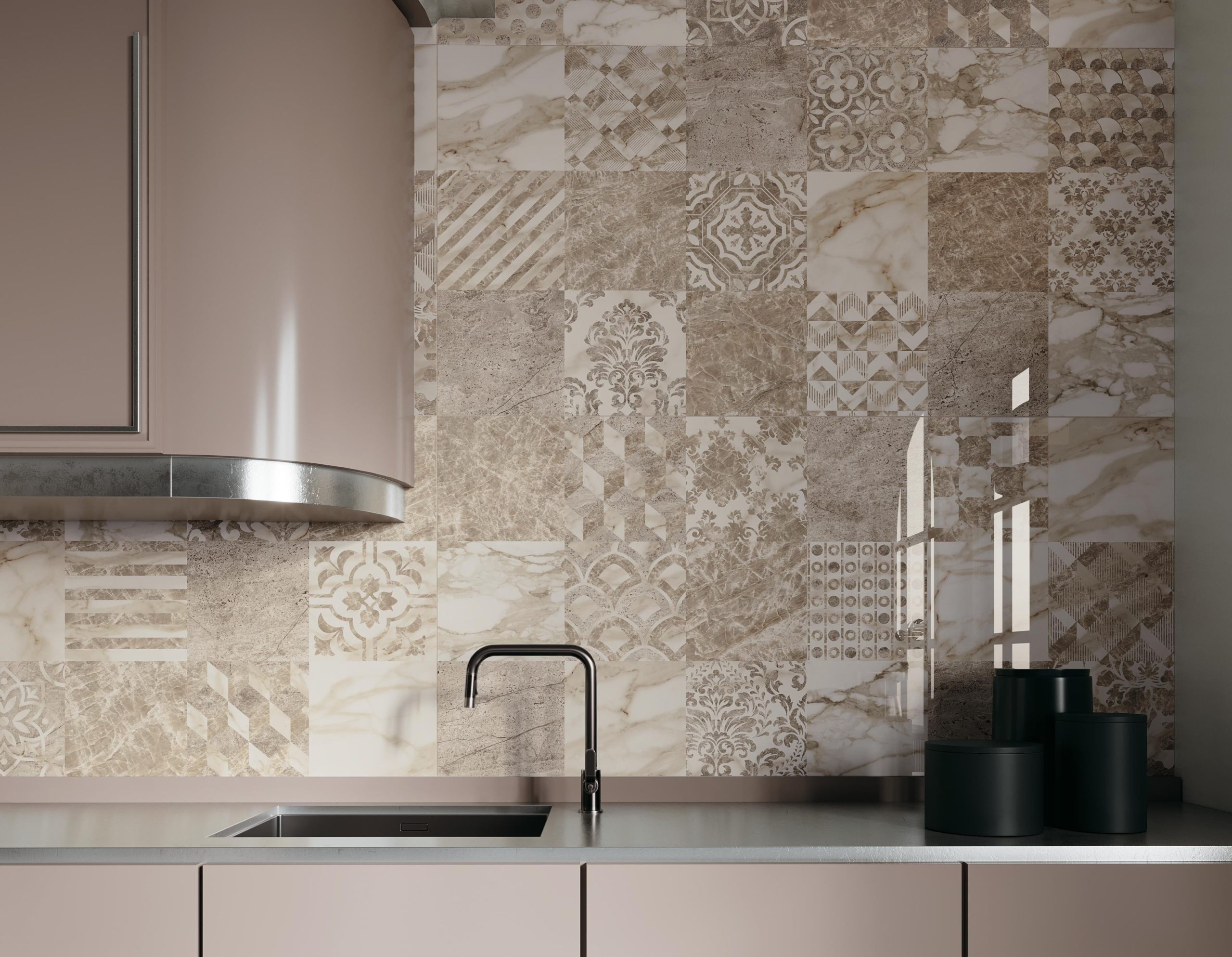 — В составе Atlas Concorde Empire есть широкоформатный керамогранит, керамогранит, бордюры, мозаика, ступени, вставки, мозаика с рисунками под мрамор.