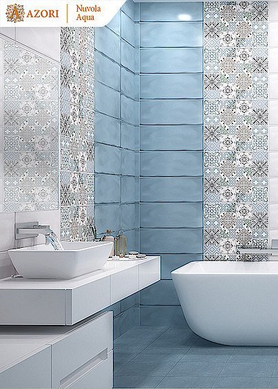 — В составе Azori Nuvola есть бордюры, декоративные элементы, керамическая плитка, мозаика с рисунками орнамент, моноколор, абстракция.