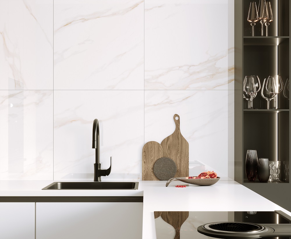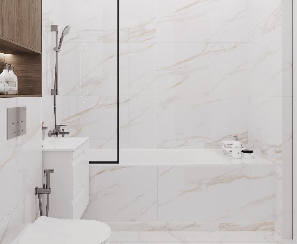 — В составе Ceradim Calacatta Regal Gold есть керамогранит, мозаика с рисунками под мрамор.