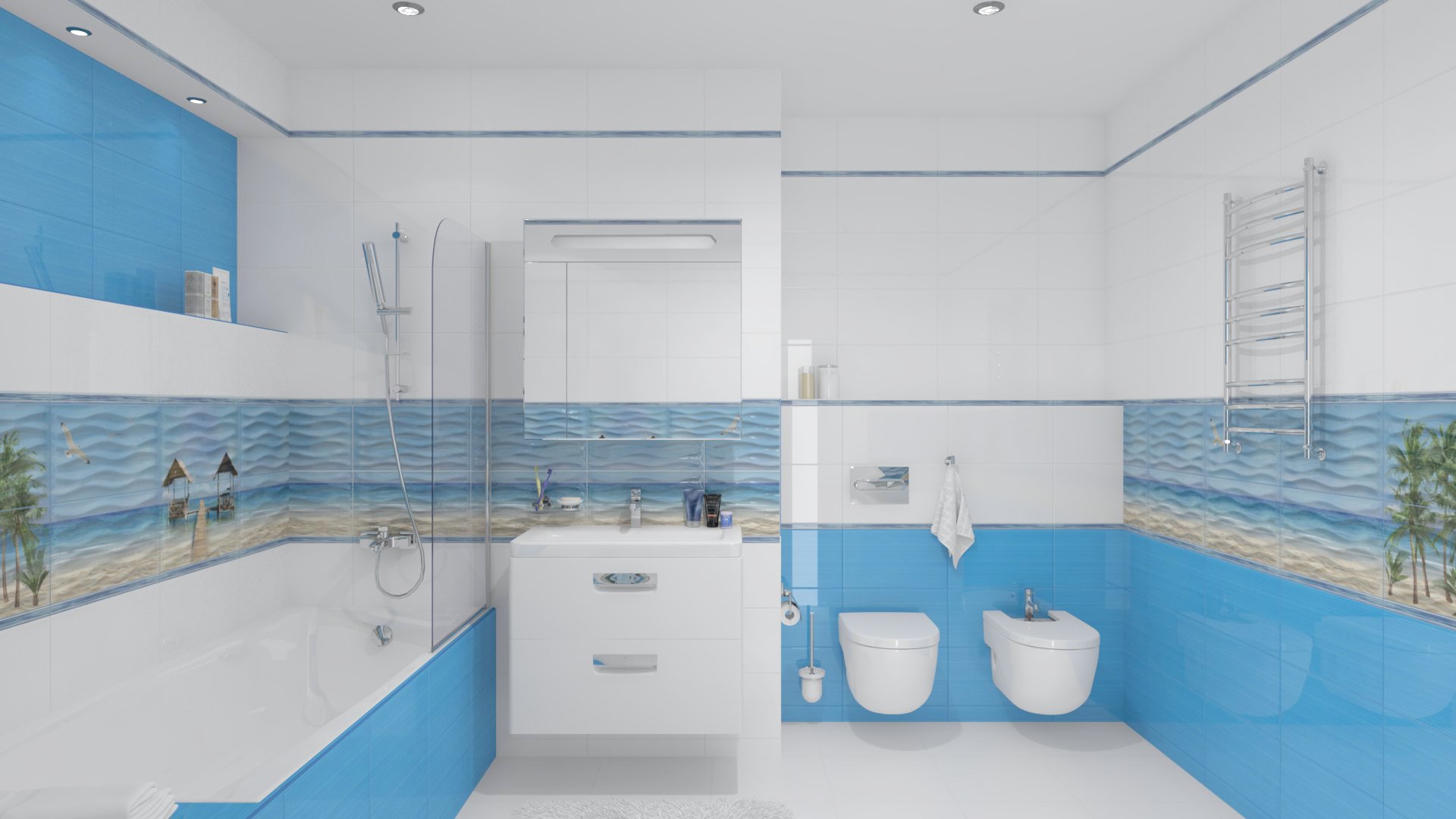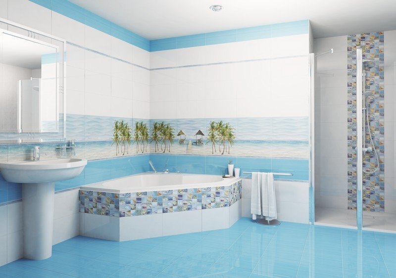 Керамическая плитка Ceradim Lagune для отделки стен в ванной комнате представлена размером 250х450 мм и имеет глянцевую поверхность. Она долговечная, термостойкая и легко моется. Из данной плитки можно выложить великолепное панно на стене. Рисунок, предложенный дизайнерами, поможет создать свой райский островок. Лазурный океан, голубое небо, нежный песок и пальмы – такая атмосфера в ванной комнате подарит минуты отдыха и неги. Плитка для ванной Ceradim Lagune создаст панорамный вид на прекрасный берег. Реалистичность изображения достигается за счет применения цифровой печати.