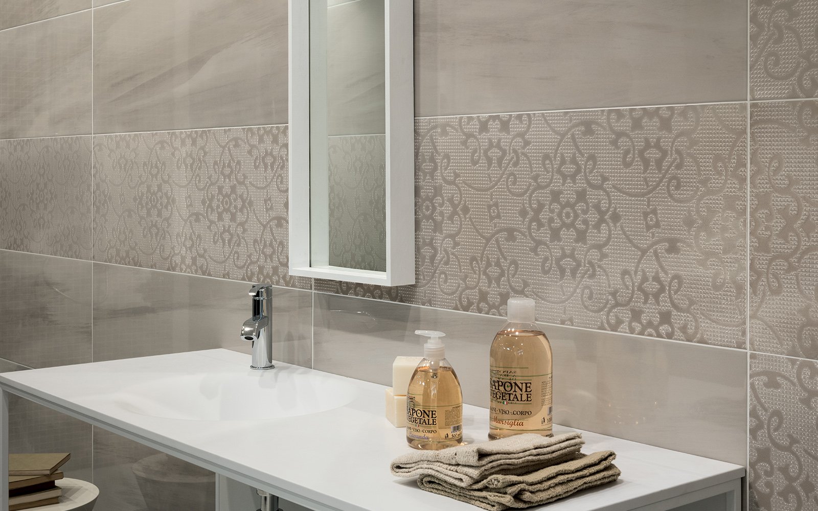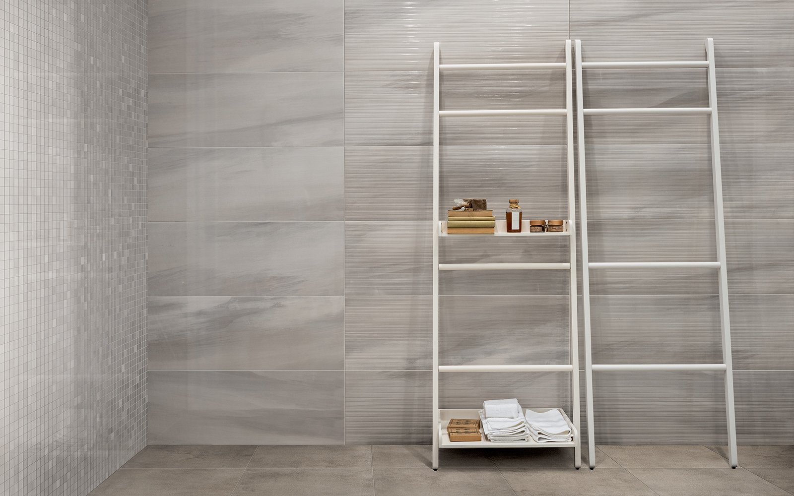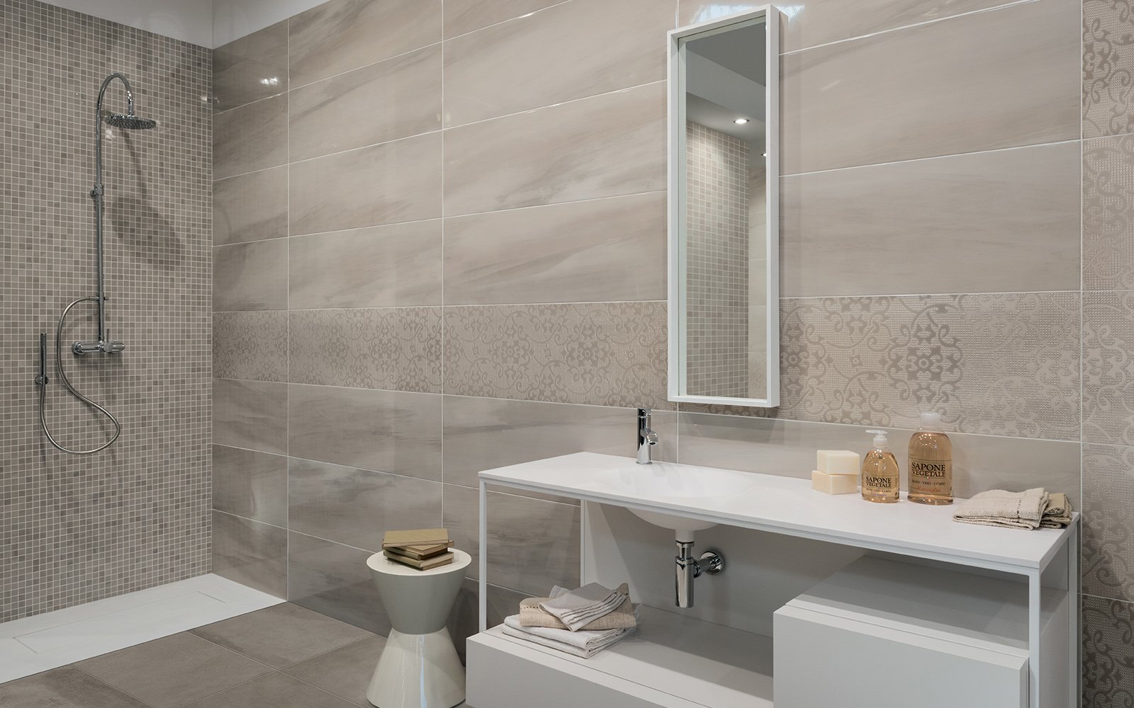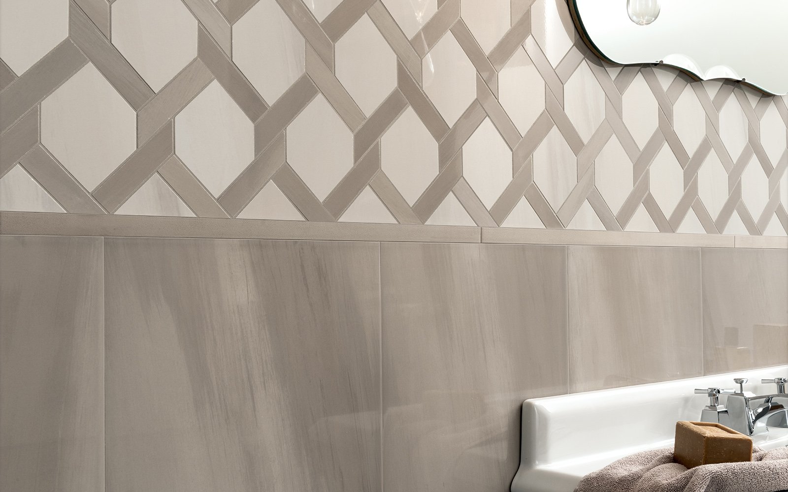 Эффектная, но предельно простая по дизайну – именно такая плитка входит в состав коллекции Dom Spotlight, привлекая ценителей оригинальных вариантов интерьерной отделки. Цветовой спектр включает различные тона белого, серого и айвори, которые добавляют изысканности, тогда как глянцевый блеск сразу привлекает к поверхности внимание. Кроме плитки размером 33,3 на 100 сантиметров в наличии идентичные по расцветкам и рисунку бордюры формата 1 на 33,3 сантиметра, с помощью которых можно обустроить переход от пола к стенам. Лучше всего подходит плитка Dom Spotlight для гостиных и ванных комнат.