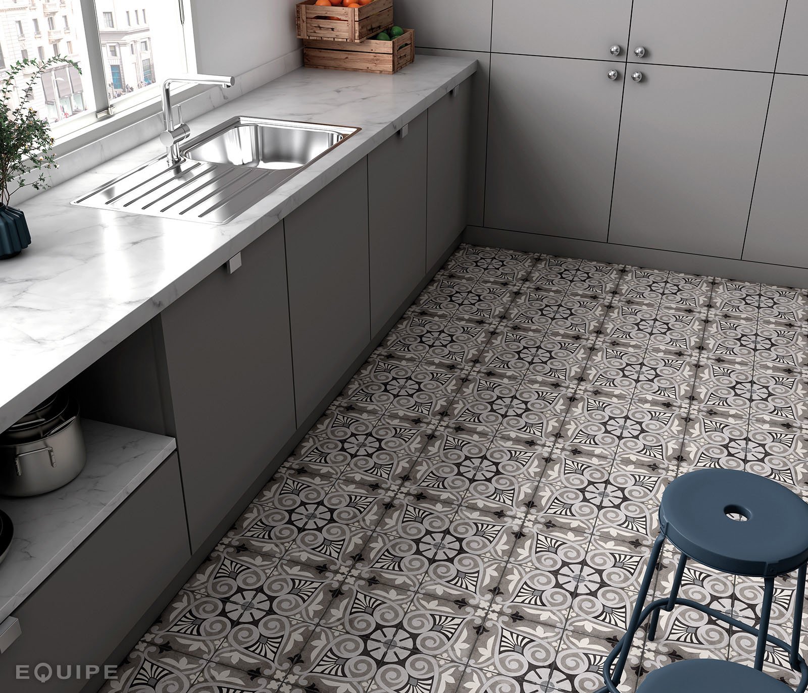 Изумительная и необычная коллекция испанского керамогранита Equipe Art Nouveau позволит вам воплотить свои мечты об идеальном интерьере ванной, гостиной и кухни в реальность. Коллекция дополняется потрясающими элементами декора в виде различных орнаментов, абстракций и геометрических узоров. Керамогранит для пола Equipe Art Nouveau представлен одним размером – 20x20 см. Поверхность плитки матовая и покрыта специальным антискользящим покрытием. Фоновая плитка имитирует рисунок бетона. Вместе с декором, базовая плитка превращается в настоящее полотно искусства.