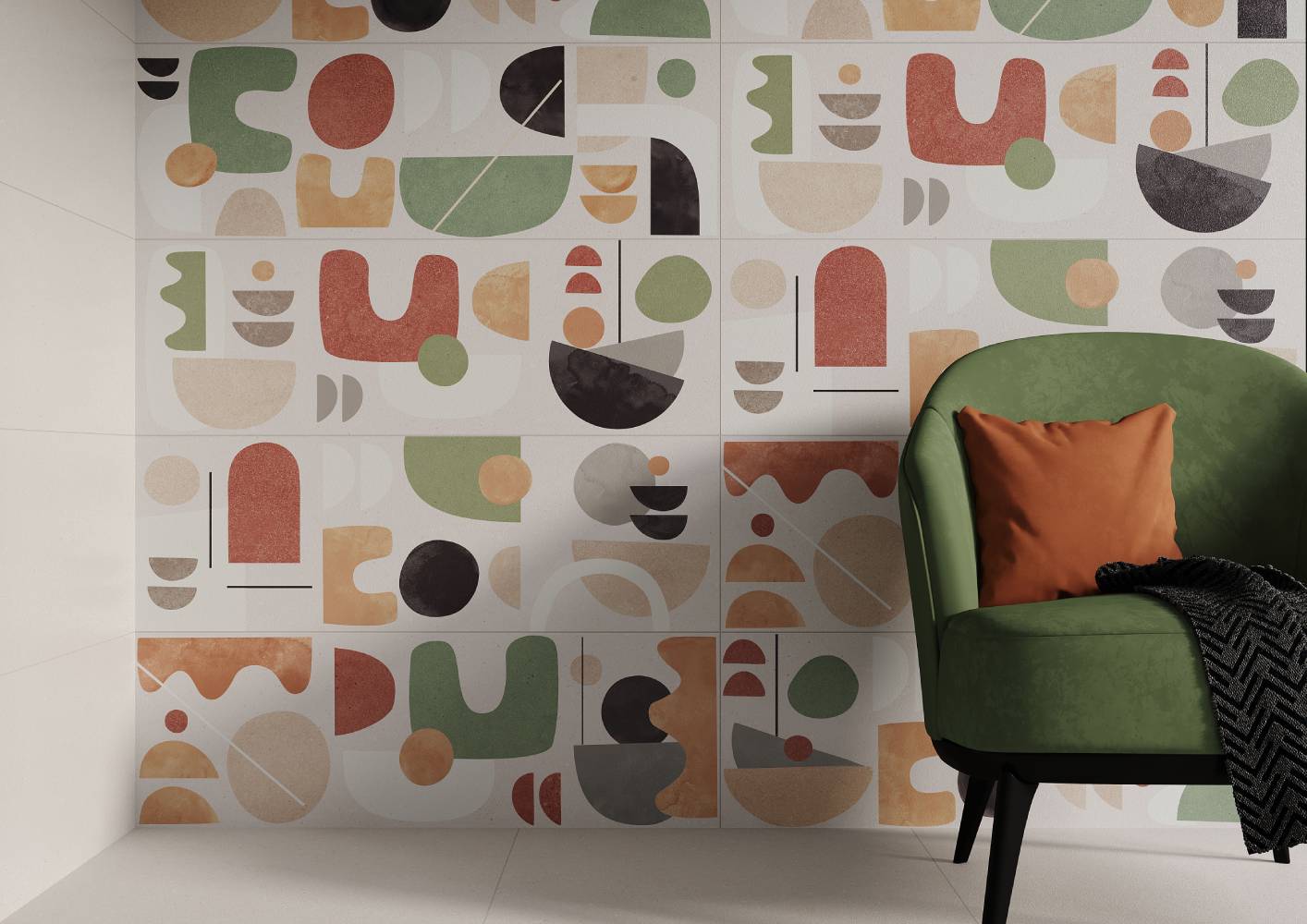 — В составе Gracia Ceramica Wabi-Sabi есть декоративные элементы, керамическая плитка, мозаика с рисунками абстракция, в полоску.