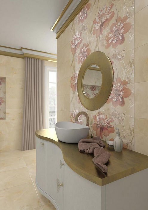 Если для покупателя облицовочного материала первоочередным требованием является качество и безупречный внешний вид, обязательно стоит обратить внимание на коллекцию керамической плитки для ванной комнаты lazio, которая изготовлена по самым современным технологиям, отличается прекрасными технико-эксплуатационными характеристиками. Полированный керамогранит станет настоящим украшением пола, а на стене изумительно будет смотреться цветочное панно из той же коллекции с преобладающими пастельными оттенками. Можно смело экспериментировать, выбрав самую разную раскладку плитки на стене, тем самым сделав интерьер полностью индивидуальным.