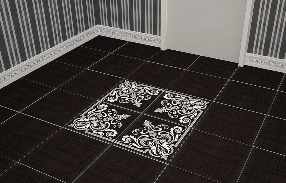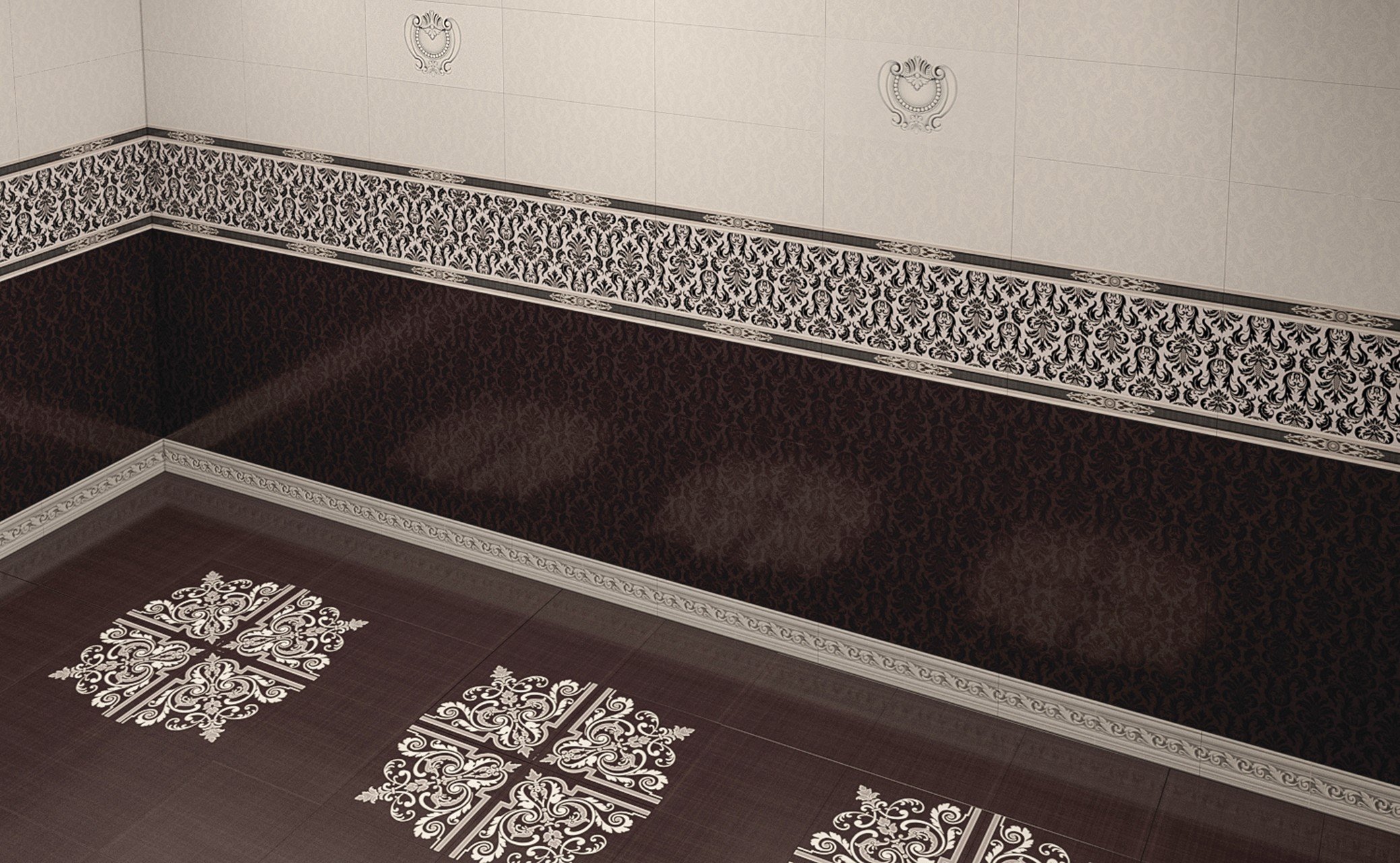 — В составе Piastrella Дамаск Ротонда есть керамическая плитка, декоративные элементы, бордюры, мозаика с рисунками орнамент, под ткань, узор.