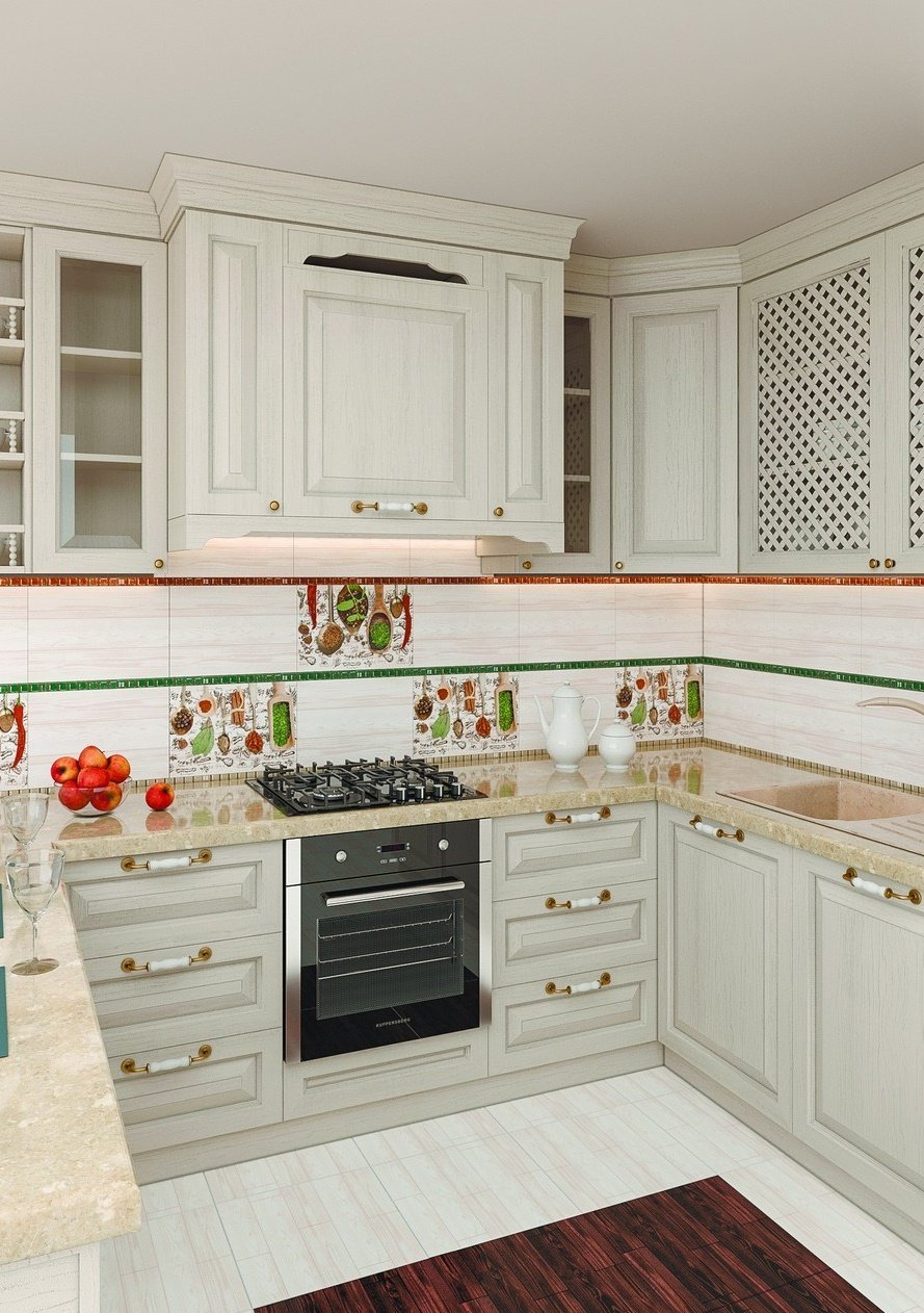 — В составе Piastrella Дриада Специалле есть керамическая плитка, декоративные элементы, бордюры, мозаика с рисунками под паркет, абстракция, геометрия.