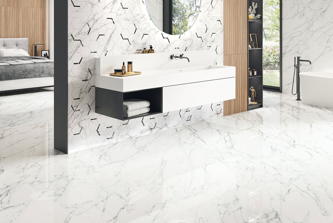 — В составе Porcelanite Dos Loira есть широкоформатный керамогранит, керамогранит, мозаика с рисунками под мрамор.