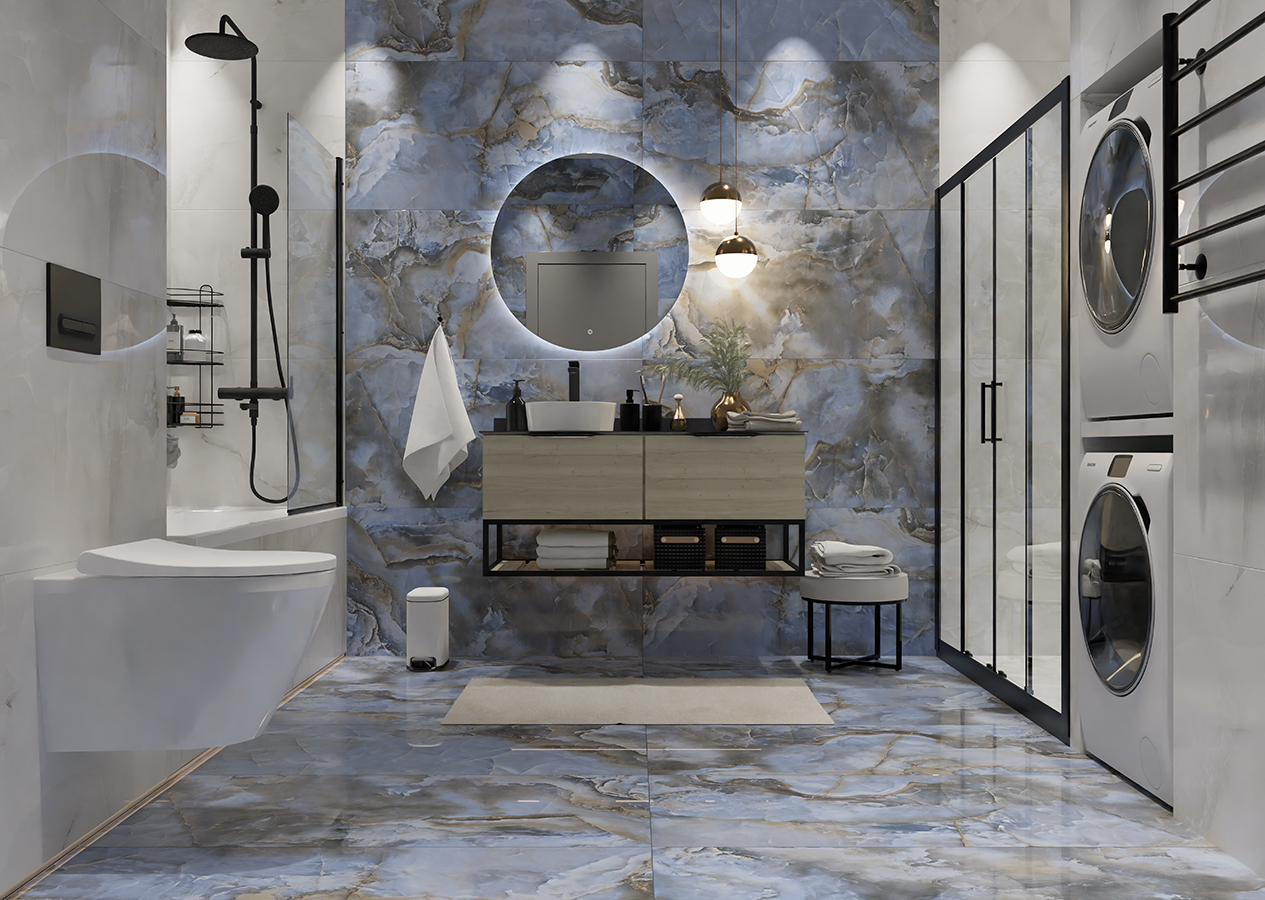 — В составе Primavera Honey Onyx Blue есть керамогранит, мозаика с рисунками под оникс.