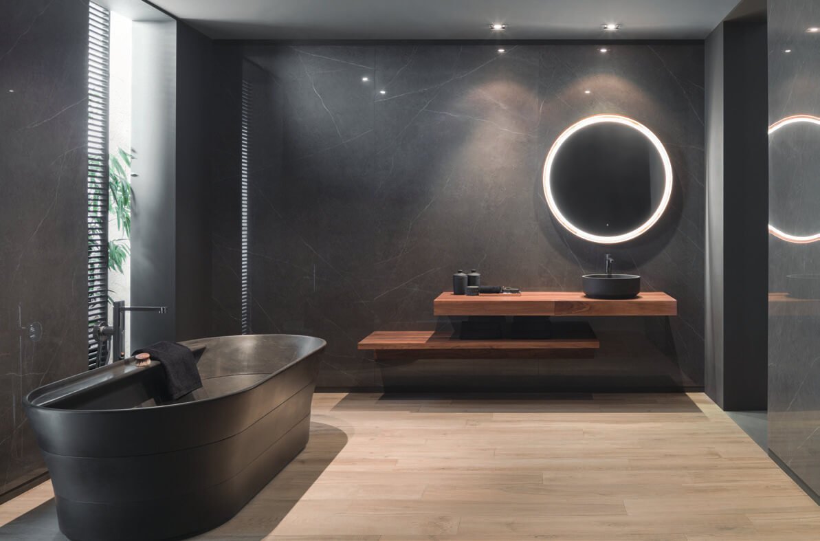 — В составе Xtone (Urbatek) Liem есть керамогранит, широкоформатный керамогранит, мозаика с рисунками под мрамор.